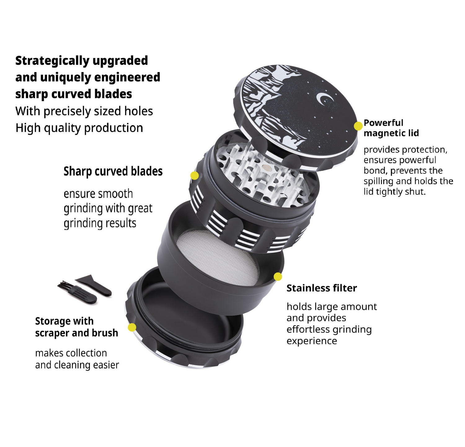 Especially amplified magnetic lid makes this herb grinder tougher and durable for years and gives no chance for herbs to spill out even if grinder falls on the floor.