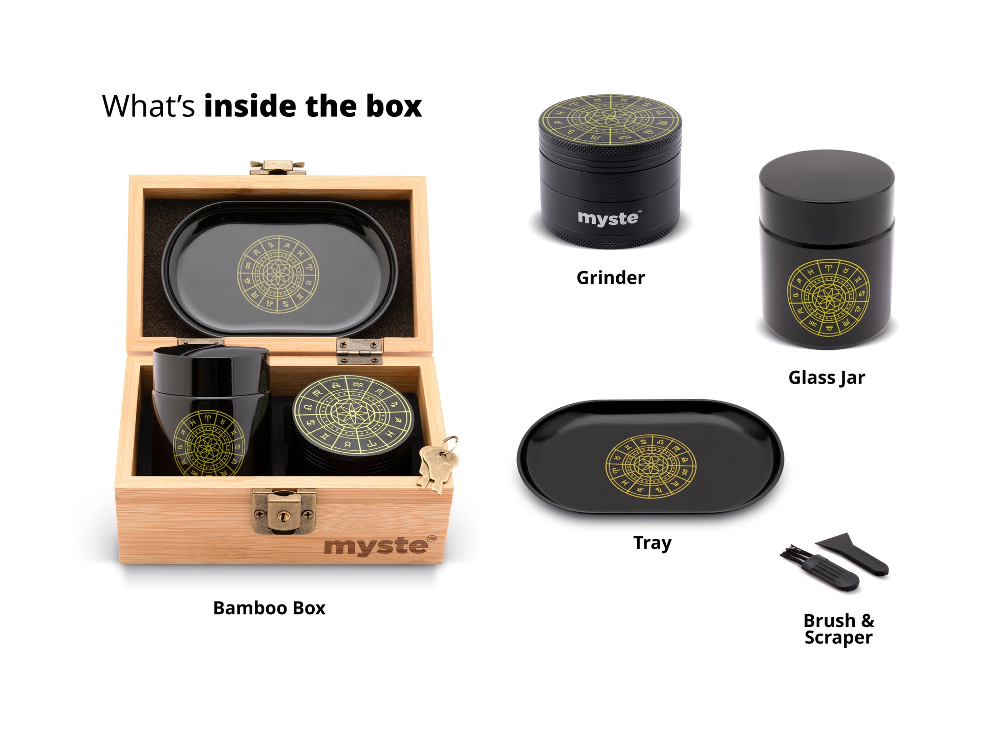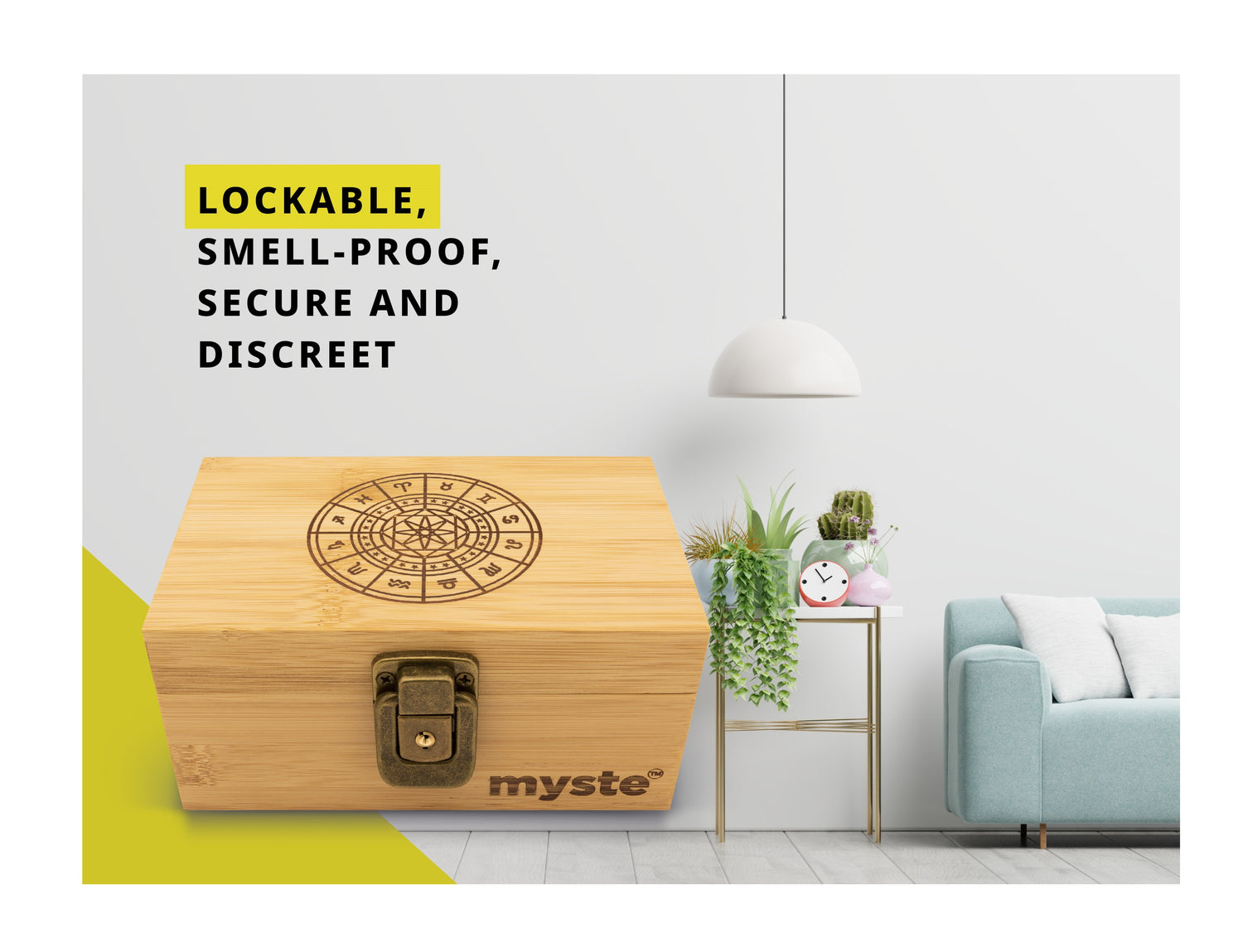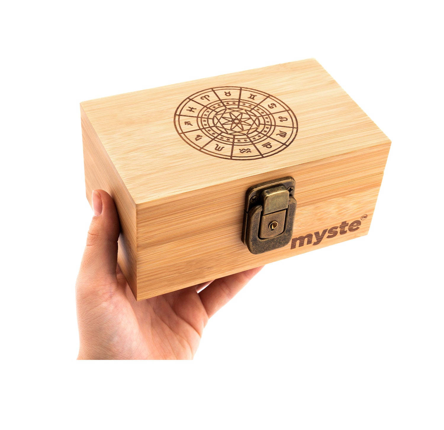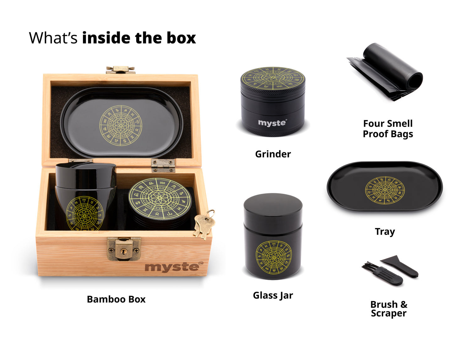 MYSTE™ Zodiac Brown Stash Box comes with magnetic grinder 2.5 Inch (63mm), premium wooden box, glass UV jar, rolling tray, 4 smell proof bags, lock, keys, small Zodiac cardboard card.