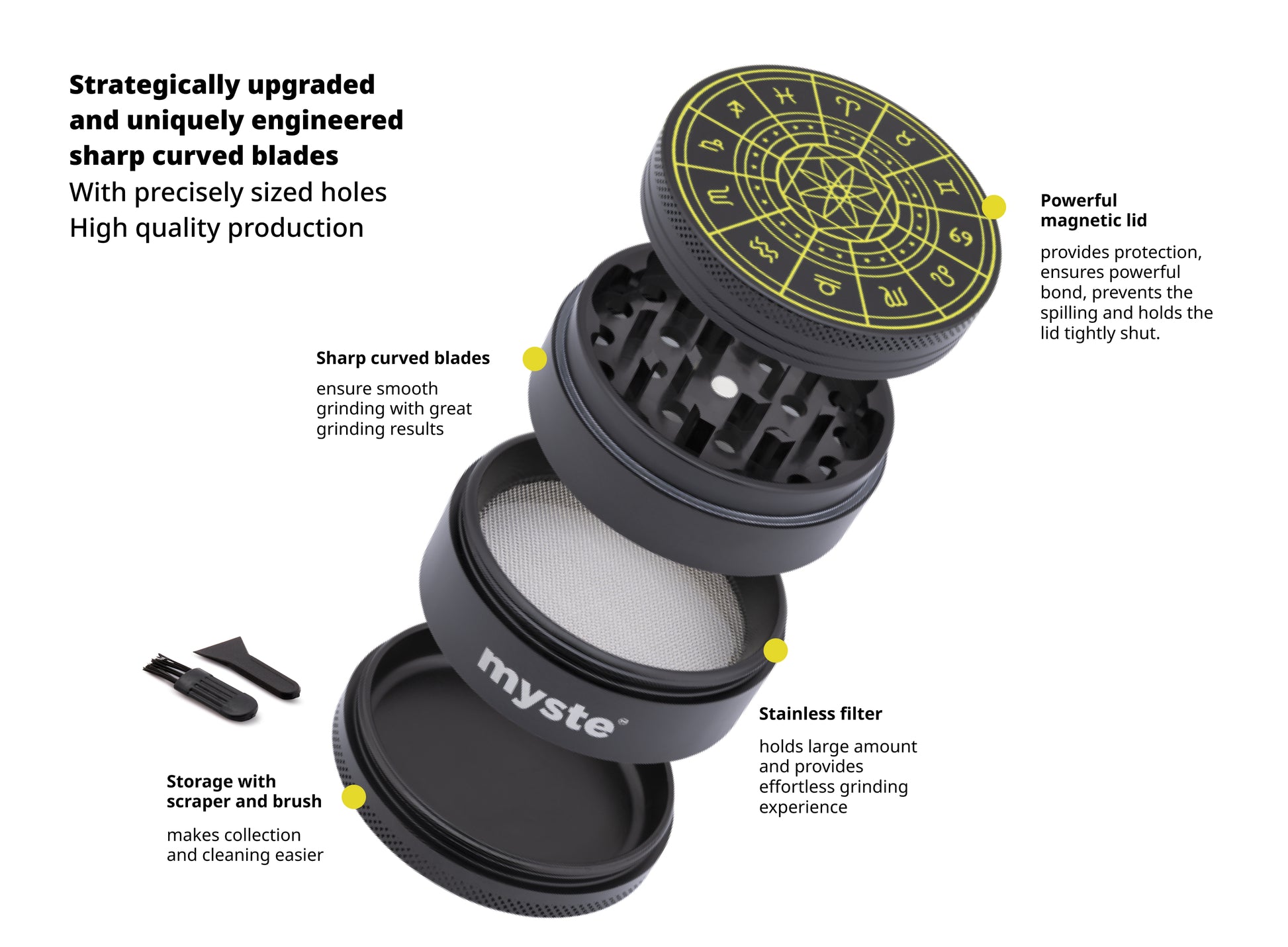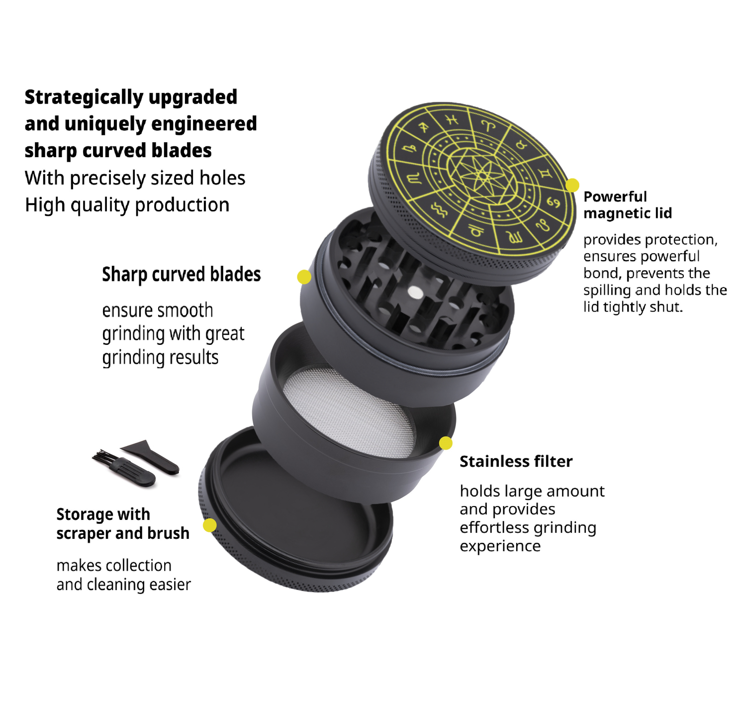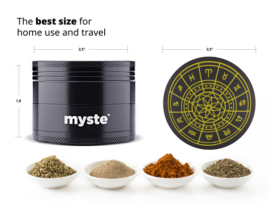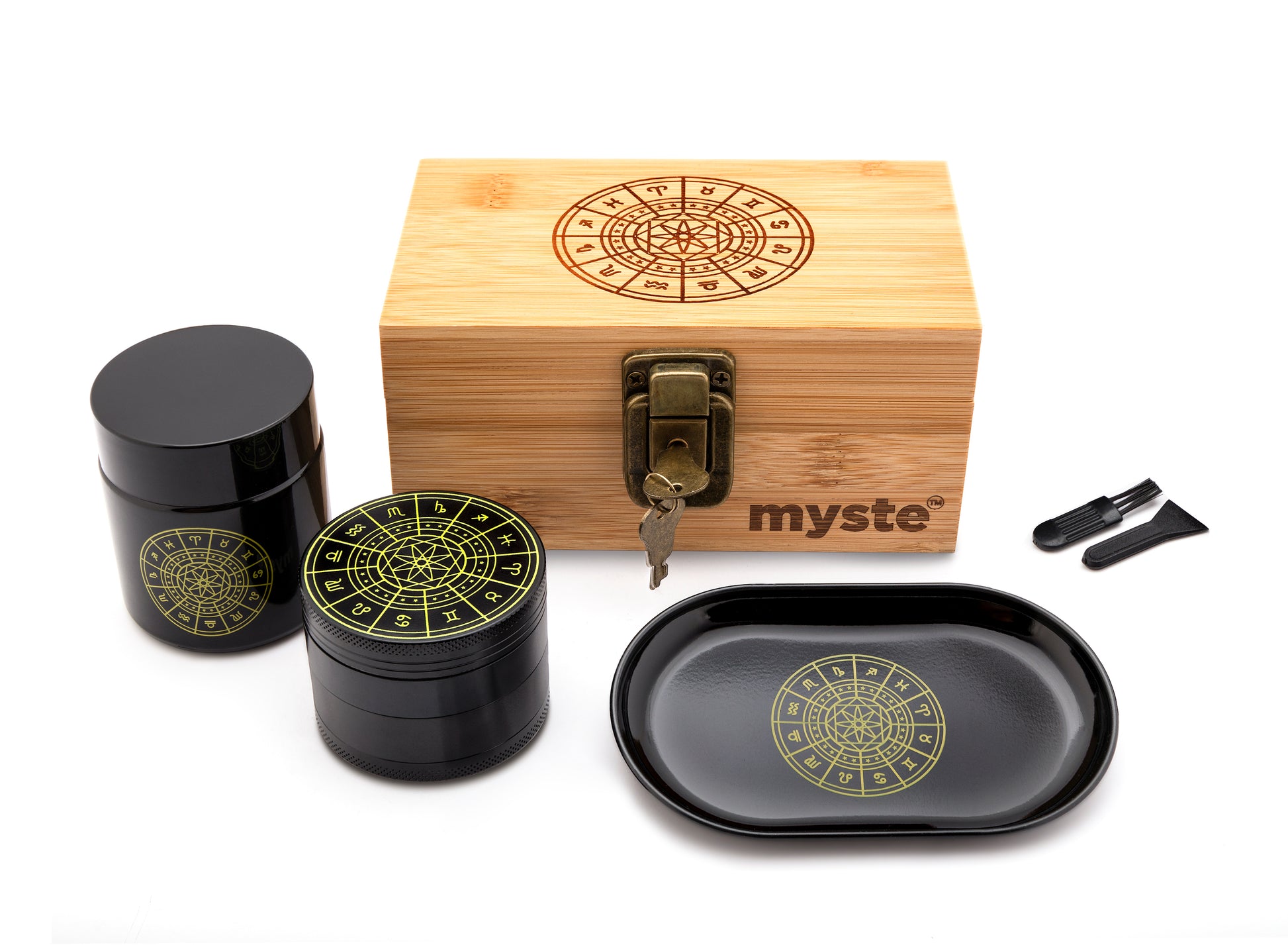 MYSTE™ Zodiac Brown Stash Box comes with magnetic grinder 2.5 Inch (63mm), premium wooden box, glass UV jar, rolling tray, 4 smell proof bags, lock, keys, small Zodiac cardboard card.